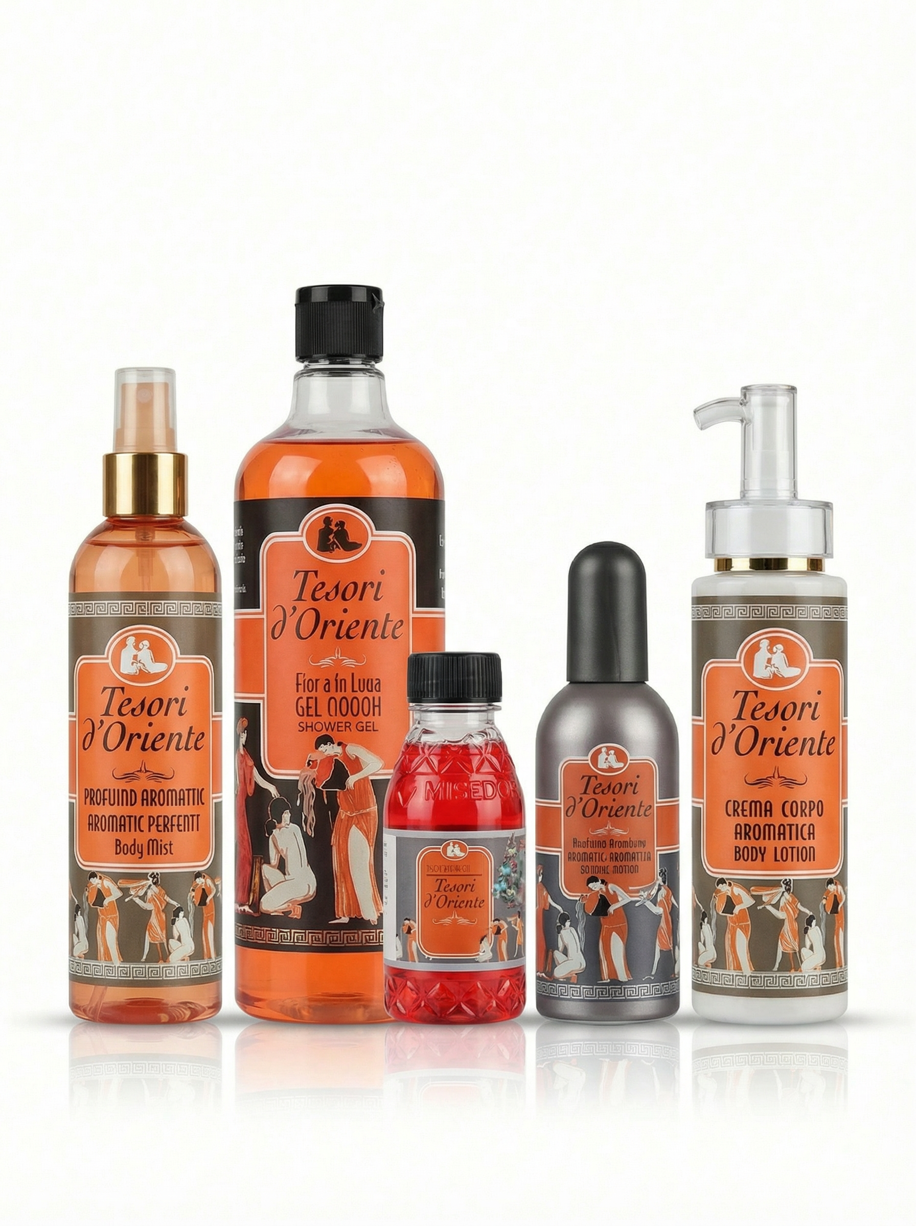 باكدج تيزوري من Tesori d'Oriente التي تشتهر بروائحها الشرقية والزهرية ومنتجات ايطالية فاخرة وتتضمن شاور جل - 1000 مل، برفيوم تيزوري الإيطالي الأصلي، لوشن- 250 مل، سبلاش - 250 مل، وخمرة سوداني للجسم برائحة تيزوري