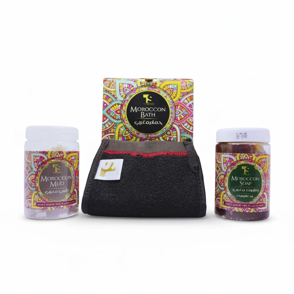 انقلي تجربة "السبا" الملكية إلى منزلك مع مجموعة الحمام المغربي الفاخرة من "تي اس كوزماتيكس". هذه المجموعة ليست مجرد أدوات تنظيف، بل هي طقس متكامل لتجديد روحكِ وبشرتكِ. تجمع المجموعة بين ثلاثة أسرار طبيعية من قلب المغرب: الصابون المغربي المصنوع من مواد طبيعية خالصة لترطيب الجلد وتليينه، وليفة التقشير الاحترافية المستخرجة من ألياف الأشجار التي تزيل خلايا الجلد الميتة ببراعة، وطين الأطلس المغربي الأسطوري. هذه التركيبة الثلاثية تعمل بتناغم تام لتمنح جسمكِ نعومة الحرير ونقاء الكريستال، مع إعادة الحيوية المفقودة لبشرتكِ بلمسة واحدة.